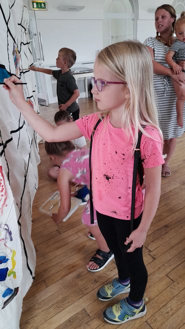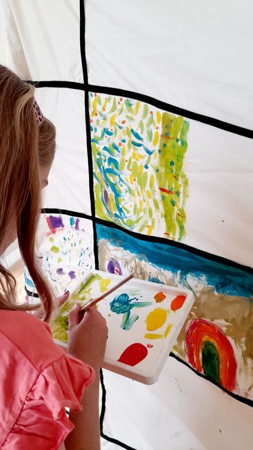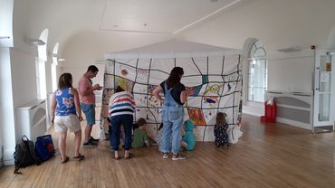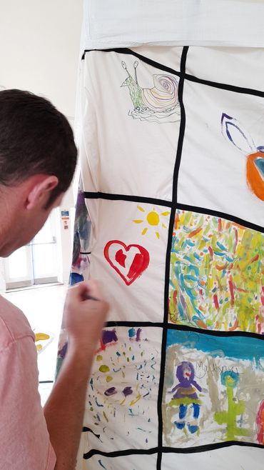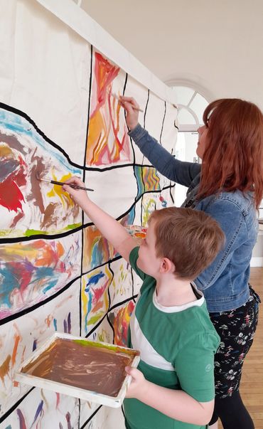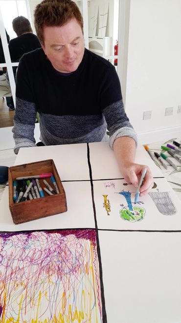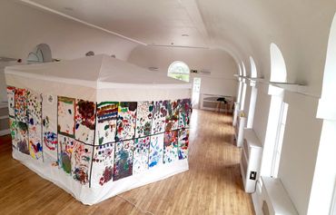 'Improvising with Sound and Paint' was a workshop project with children at Angel Road Infant School, led by the Norwich-based duo The Tree and the Bell (trumpeter Chris Dowding and double bassist Dave Pullin), with artist Gillian Francis and her company Make Play Connect. It was made possible with funding from the Norfolk County Council's Arts Project Fund and Catton Grove Big Local. The project explored ideas of field recording, making artwork in response to The Tree and Bell's music, and also playing with percussion and improvised conducting. It culminated in an installation upstairs at The Feed cafe at Waterloo Park, which featured the children's artwork alongside a sound piece made from recordings made during the workshops. Visitors on the day of the installation were also encouraged to add their own square of artwork in response to the installation.